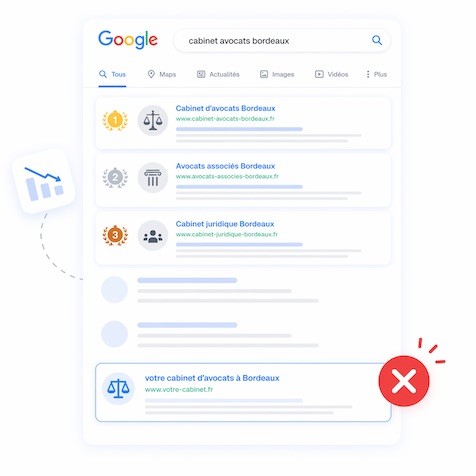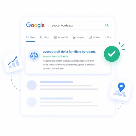 Votre site est construit pour apparaître sur les recherches réellement tapées par vos futurs clients au moment où ils ont besoin d’un avocat.